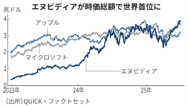 9日の終値ベースでは前日比で約2%高の162ドル超で、時価総額は4兆ドルを割り込んだ。QUICK・ファクトセットによると、これまで終値の時価総額はアップルが24年12月に記録した3兆9150億ドルが上場企業として史上最大だった。エヌビディアの時価総額は9日の終値でこれを上回った。